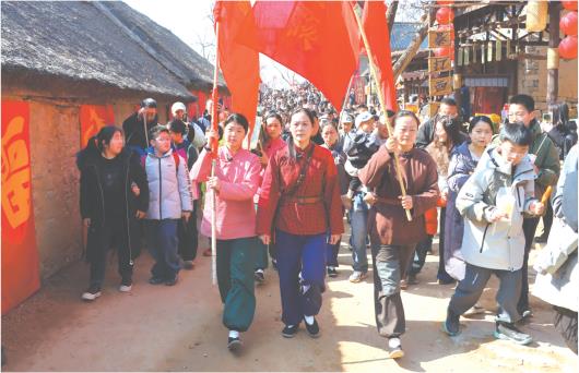 这条线路全长1200米,户外进行,分为动员会、600年常山庄古村行军、穿越枪林弹雨、向古县城冲锋、胜利后跳欢庆舞蹈、扭秧歌庆祝等体验环节。行进途中,游客可以高举红旗,也可以身扛弹药箱,感受战争年代沂蒙老区群众支前的艰辛。今年春节期间,线路每天两场,场场爆满。“过年了,出来玩玩,锻炼锻炼,很好,很充实。”河北沧州游客赵继民和儿子体验了《重走支前路》后兴奋地说。