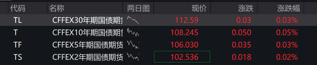 国债期货开盘多数持平,30年期主力合约跌0.01%,10年期主力合约涨0.00%,5年期主力合约涨0.02%,2年期主力合约跌0.00%。