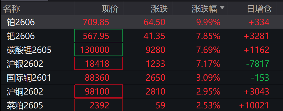 商品期货开盘,铂主力合约涨超9%,钯涨超6%,沪银涨超5%,国际铜、碳酸锂涨近3%。