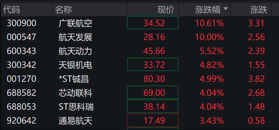 商业航天概念延续强势,神剑股份7连板,九鼎新材4连板,大业股份3连板,佳缘科技20cm涨停,广联航空涨超10%。